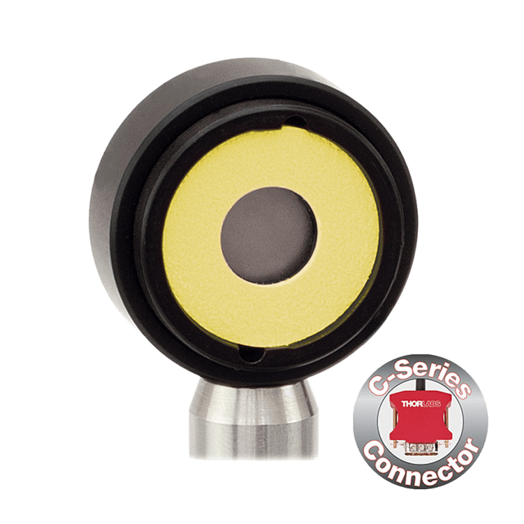 The S120C power head is designed for general purpose optical power measurements. The head is optimized for small thickness to fit in tight spaces. The high sensitive photodiode with large active area in combination with a reflective, diffused ND filter enables power measurements up to 50 mW in free-space and fiber-based applications. A removeable annular VIS/IR viewing target allows conveniently centering the measured beam to the active area of the photo-diode. The target absorbs light from 400 to 640nm and 800 to 1700nm.