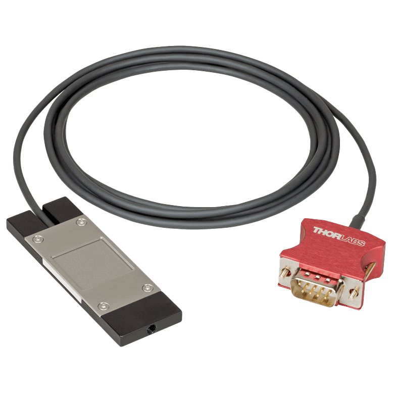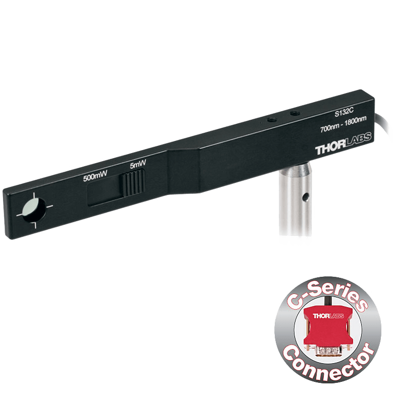 The S132C with its slim design of only 5 mm at the detector side is perfect to fit into tight optical setups. The ruggedized aluminum head with its large active area silicon photodiode can be held by hand or can be mounted with its 8-32 and M4 threaded mounting holes to posts and post holders. A slideable ND filter enlarges the power range by approximately a factor of 100; the position of the filter is automatically recognized by the connected console after a few seconds for calculating the power level with the right responsivity value. For sensor readout, the S120VC is compatible with any Thorlabs consoles and interfaces equipped with a DB9 connection, and rated for photodiode power measurement. A non-volatile memory in the sensor connector contains sensor information data and the NIST and PTB traceable calibration data.