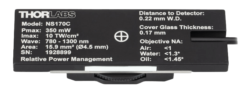 The NS170C sensor is designed to measure the relative peak power of two-photon lasers by utilizing a second-order nonlinear β-BBO crystal to convert incident ultrafast NIR pulses into their visible second harmonic. Shortpass filters underneath the β-BBO crystal reject the residual NIR light, allowing only the second harmonic light to transmit down to a large area silicon photodiode sensor. At the entrance of the sensor is a 170 µm thick cover glass sealed to the sensor housing, allowing the sensor to be used with dry, water immersion, and oil immersion objectives. The working distance from the top of the cover glass to the β-BBO crystal is 0.22 mm.