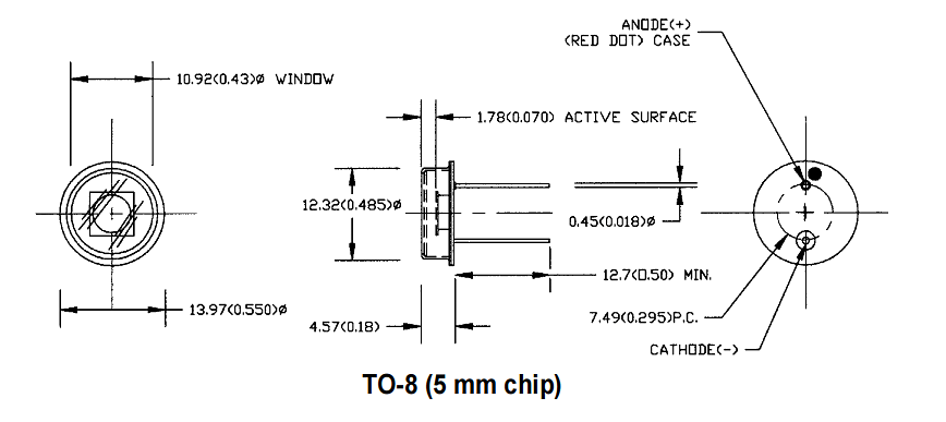 5×5 photodiode is ideal for measuring both pulsed and CW fiber light sources by converting optical power into electrical current. The detector is ceramic with an anode and cathode. The photodiode anode produces a current, which is a function of the incident light power and the wavelength. The responsivity, Ը(λ), can be read from the plot on the following page to estimate the amount of photocurrent. This can be converted to a voltage by placing a load resistor (RL) from the photodiode anode to the circuit ground. Where P is the power, the output voltage is expressed by