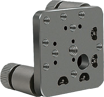 平台表面有9個M4 螺紋孔陣列和1個M4通孔,還有1個M6的螺紋孔用於安裝有螺紋的元件。也可利用背板兩側的任一個M4頭孔將附調整架豎直安裝到接桿上。每個用於接桿安裝的孔包含兩個對準孔銷,用於在較大光學組件中達到精確對準。