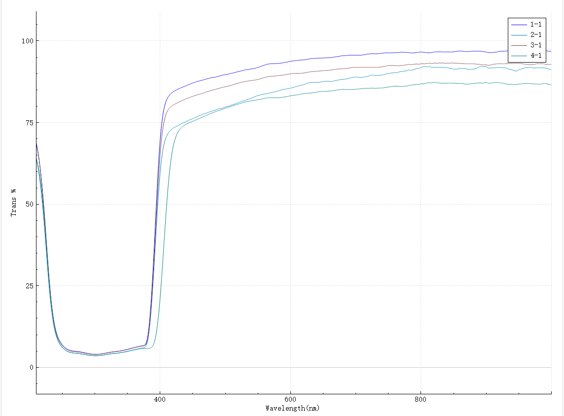 1-4號樣品1號區域檢測結果如上圖所示,4個樣品均對紫外線有較強的吸收,400-1000nm波段,光透過率較高,整體在80%以上,1號樣品最高可達97%。