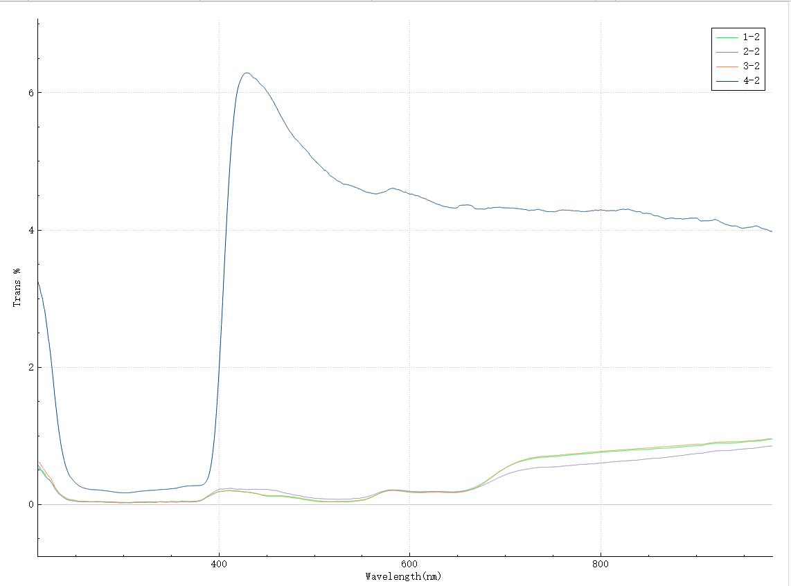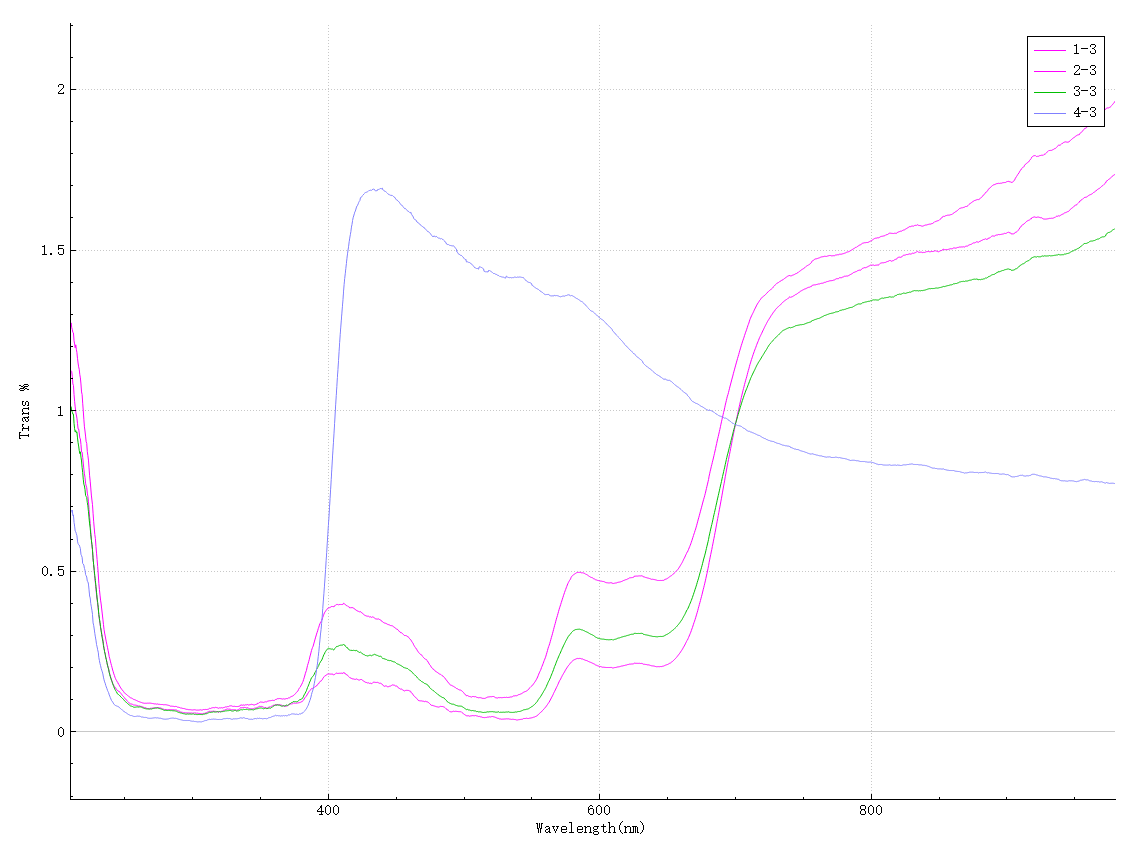 1-4號樣品2號、3號區域檢測結果如上圖6-7所示,1-3號樣品2號、3號檢測區域透射率均低於2%,結合圖5可知,4號樣品在檢測波段範圍內,1至3號區域透射率逐漸降低,樣品透射率最高可達87%。