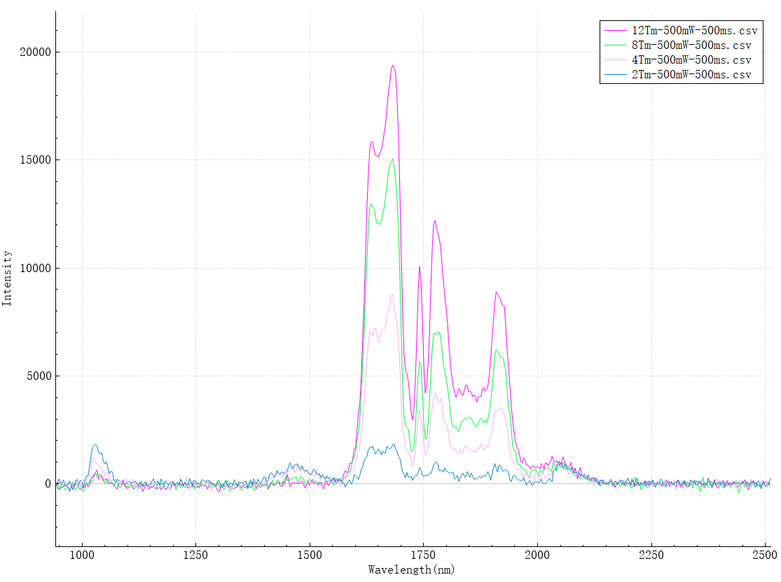 不同Tm含量摻雜的稀土奈米顆粒樣品光譜圖