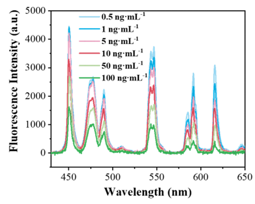不同濃度氨苄青黴素作用下的牛奶上轉換螢光光譜圖