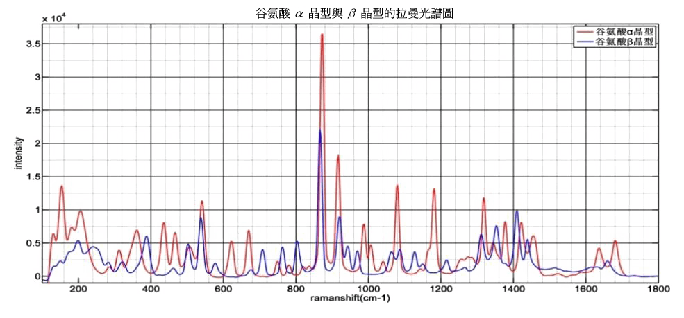 谷氨酸 α 晶型與 β 晶型的拉曼光譜圖